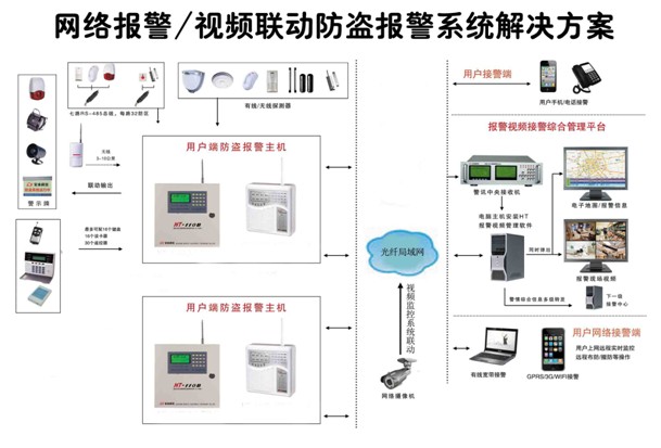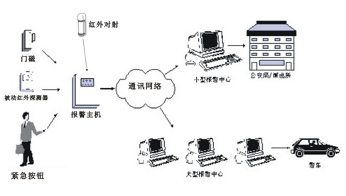 智能化防盗系统采用星型结构,可分为报警中心和用户终端两部分。报警主机直接接入报警中心,通过系统交换机与报警主机联系,中心软件。打印机、音箱、声卡等设备与住户报警中心直接兼容。用户终端分为报警主机、探测器、警示设备三类。