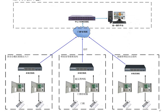 本方案采用局域网门禁系统联网控制,该方案适用于办公地点比较集中,以性能为优先考虑的中高端门禁系统。