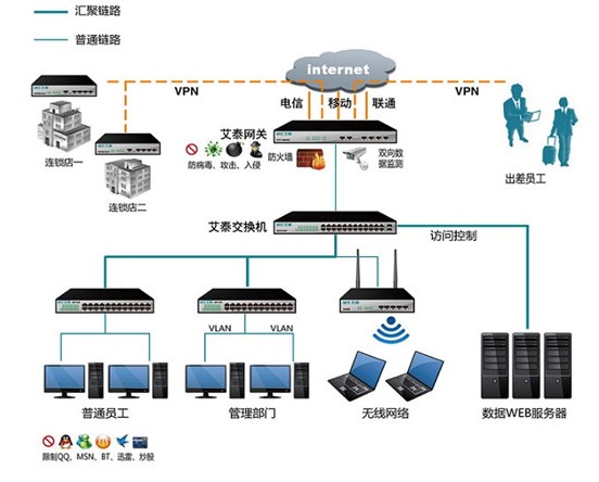 随着网络中各类热门应用的频繁出现,不加管控的网络已经给连锁机构带来了不少困扰,员工上网聊天、炒股、在线视频等网络活动,影响了网络资源,降低员工的工作效率,在一些关键部门,还带来了不少的信息安全隐患。因此中小型企业在建设网络的时候,需要很好的管控员工上网行为,成为中小型企业的首要任务。