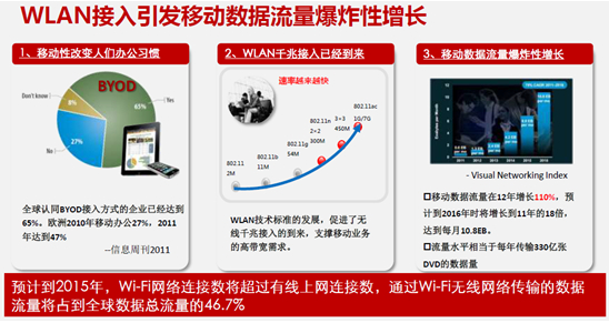 随着智能终端的快速普及以及移动互联网业务的快速发展, WLAN不断向前推进,如今,WLAN在企业和家庭中无处不在,已成为用户访问互联网的主流接入方式。在企业无线业务的不断多样化的背景下,企业WLAN也井喷式的发展,为提高企业办公效率助一臂之力。
