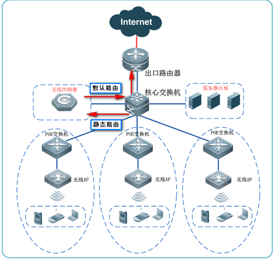 为了满足用户构建一个高速、稳定、安全、可靠、易于管理的无线接入网络的需求,本设计方案按照敦崇科技的FIT_AP+WAC的结构化无线网络解决方案进行设计。整体框架基于瘦AP方式部署,采用WAC(无线控制器)对AP进行集中管理、控制、配置下发,以及对接入终端的认证、数据分布式/集中式转发、漫游等功能。操作和维护工作现在只需要在WAC上进行就可以了。在这个架构里,AP只负责无线信号的收发,不作MAC层及其以上的协议层处理,所有的智能工作都由WAC完成。