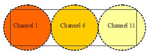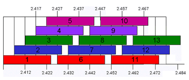 AP的信道根据蜂窝结构的原则,采用不同信道避免同频干扰,根据现场实际环境划分;WLAN 802.11b/g/n工作在2.4GHz频段,频率范围为2.400~2.4835GHz,共83.5M带宽,划分为13个子信道,每个子信道带宽为22MHz。子信道分配如下图所示。